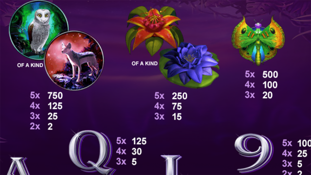 Базовые картинки делятся на 2 вида: карточные и тематические. Номиналы карт имеют небольшие коэффициенты — от х5 до х150. Изображения (бабочка, сова, койот) приносят большие выигрыши — от х15 до х750. Скаттер представлен в виде иконки с ночным пейзажем и надписью «Scatter». Он приносит приз, независимо от того, на каком месте поля выпадет. Дикий символ выполняет изображение черной пантеры. Он способен заменить другие иконки. Любая цепочка с участием Вайлда приносит удвоенную награду.